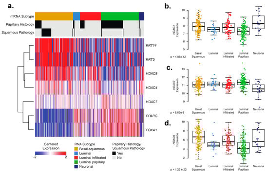Histone deacetylase (HDAC4) and HDAC9 expression co-clusters with basal markers in muscle-invasive bladder cancer (BC). (a) Heat map display of expression values (log2(normalized RSEM + 1)) from the Cancer Genome Atlas (TCGA) bladder cancer cohort (n = 408) for HDAC4, HDAC7, and HDAC9, as well as select genes that serve as markers of luminal (forkhead box A1 (FOXA1), peroxisome proliferator-activated receptor gamma (PPARG)) and basal (KRT14, KRT5,) BC. Hierarchical clustering was applied after median centering the expression values by gene. Annotation tracks show gene expression subtype, histological subtype, and squamous pathology classification. (b) HDAC4 is overexpressed in neuronal, basal-squamous, and luminal infiltrated subtypes. (c) While statistically significant among subtypes, HDAC7 occurs as decreased expression in neuronal subtypes and increased in luminal papillary subtypes. (d) HDAC9 is overexpressed in basal–squamous and luminal infiltrated subtypes.