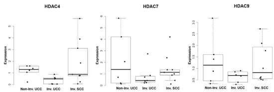 Quantitative real-time polymerase chain reaction (PCR) analysis of Class IIa histone deacetylase (HDAC) expression in bladder cancer (BC) clinical specimens. Boxplot displays of HDAC expression from 24 BC patients. Patients are grouped according to conventional histomorphometric examination (see materials and methods). However, while we note a trend of increased expression of HDAC4, -7, and -9 in invasive squamous cell carcinoma (SCC) these differences are not statistically significant.