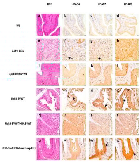 Increased expression of histone deacetylase (HDAC)4, -7, and -9 is observed in commonly used bladder cancer BC mouse models. In normal mouse epithelium (a), HDAC4 (b) and -7 (c) is not expressed and HDAC9 is positive (d). In mice treated with 0.05% N-Butyl-N-(4-hydroxbutyl)nitrosamine (BBN) for 20 weeks (e), we observed increased expression of HDAC4 (f) and -7 (g) in the cytoplasm, while Hdac9 was overexpressed in nuclei and cytoplasm (h). In UpkII-HRAS*/WT mice (i), we observed increased expression for all three HDACs (j–l). In UpkII-SV40T mice (m), Hdac4 (n) and -7 (o) were overexpressed in the cytoplasm and Hdac9 (p) was overexpressed in the nuclei and cytoplasm. In UpkII-SV40T/HRAS*/WT mice (q), we observed overexpression of Hdac4 (r) in nuclei and cytoplasm as well as increased expression in Hdac7 (s) and -9 (t) but primarily in the cytoplasm. Finally, in UBC-Cre/ERT2/Foxa1loxp/loxp mice (u), we observed increased Hdac4 expression (v), however, Hdac7 (w) and -9 (x) were overexpressed with intense staining observed in the basal cell populations. Black arrows are pointing towards area of interest as described.