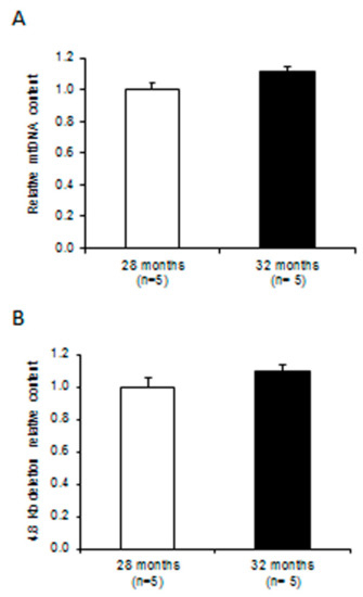 Relative contents of mitochondrial DNA (mtDNA) and of the 4.8 Kb mtDNA deletion in liver from 28- and 32-month-old rats. (A) Relative mtDNA content and (B) relative 4.8 Kb deletion content determined by quantitative PCR (qPCR). (A,B) Bars represent the mean value and SEM of two independent experiments conducted in triplicate. The comparisons were made with respect to the value of the 28-month-old rats, fixed as 1; n = number of analyzed animals.
