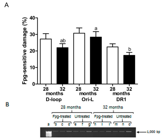 Oxidized purines-specific mtDNA damage at the D-loop, Ori-L, and DR1 regions in liver from 28- and 32-month-old rats. (A) Bars represent the mean and SEM of the values obtained for each of the five animals analyzed in both groups. Bars not showing the same superscript differ significantly; p < 0.05, Dunn’s Multiple comparison test after Kruskal-Wallis test. (B) Representative gel of formamidopyrimidine DNA glycosylase (Fpg)-treated and untreated total DNA from a 28-month-old rat and a 32-month-old animal; 2.5 and 5 ng total DNA were amplified using the D-loop long primer set (Table 1). An aliquot of each PCR amplification was loaded onto agarose ethidium bromide-stained gel and analyzed for band intensities (a: molecular weight marker (GeneRuler 100 bp DNA Ladder, Thermo Fisher Scientific); b, c, e, f, h, i, m, and n: 2.5 ng total DNA as PCR template; d, g, l, and o: 5 ng total DNA as PCR template).