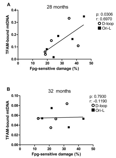 Therefore, we explored the relationship between the incidence of Fpg-sensitive damages and TFAM-bound mtDNA amount at the two regions encompassing the replication origins in each age group. The Spearman correlation analysis revealed a significant positive correlation between the incidence of oxidized purines and the amount of TFAM-bound mtDNA in 28-month-old rats (p = 0.0306; r = 0.6970, Figure 5A), but not in the 32-month-old rats (Figure 5B).