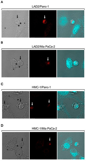 Mast cells (MCs) form synapses with pancreatic cancer cells in co-culture. LAD2 (A,B) or HMC-1 cells (C,D) were co-cultured with Panc-1 (A,C) or Mia PaCa-2 (B,D) cells at 1:1 ratio. MCs were stained with antibodies directed against tryptase and visualized by confocal microscopy. Bar = 10 μm. Arrows point to MCs, stained in red. Asterisks mark pancreatic cancer cells and arrowheads point to contact areas formed between the MCs and the pancreatic cancer cells. “Reprinted from Cancer Letters, 397, Yaara Gorzalczany, Eyal Akiva, Ofir Klein, Ofer Merimsky and Ronit Sagi-Eisenberg, Mast cells are directly activated by contact with cancer cells by a mechanism involving the autocrine formation of adenosine and autocrine/paracrine signaling of the adenosine A3 receptor. 23-32. Copyright © 2017 with permission from Elsevier”.