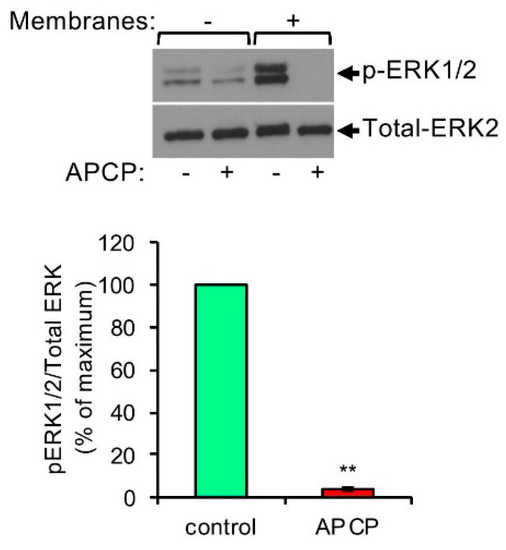 Pancreatic cancer cell derived membranes stimulate ERK1/2 phosphorylation in MCs by a CD73-dependent mechanism. LAD2 cells (1 × 106 cells/mL) were incubated for 30 min in the absence or presence of APCP (5 μM). Cells were then left untreated or treated for 1 min with membranes derived from Mia PaCa-2 pancreatic cancer cells (50 μg/mL), as indicated. Cell lysates were resolved by SDS-PAGE and immunoblotted with anti phospho-ERK1/2 antibodies, followed by reprobing with anti-total-ERK2 as indicated. A representative blot is shown. The intensities of the bands corresponding to phospho-ERK1/2 and total-ERK2 were quantified by densitometry using Image-J software and the relative pixel densities (phosphorylated/total) were calculated. Data are presented as mean ± SEM of three independent experiments. ** p = 2.0 × 10−7. “Reprinted from Cancer Letters, 397, Yaara Gorzalczany, Eyal Akiva, Ofir Klein, Ofer Merimsky and Ronit Sagi-Eisenberg, Mast cells are directly activated by contact with cancer cells by a mechanism involving the autocrine formation of adenosine and autocrine/paracrine signaling of the adenosine A3 receptor. 23-32, Copyright © 2017 with permission from Elsevier.”