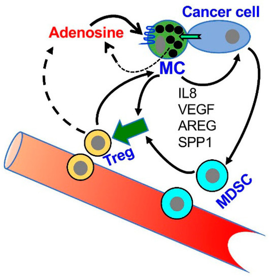 A model of the role of adenosine in the crosstalk among MCs, MDSCs and Treg in the tumor microenvironment (TME). According to this model, MCs migrate to and are activated in the TME; the activated MCs release a panel of factors that influence the attraction and activity of MDSCs and Treg cells (For details see [20,62,64]). In addition, MCs are directly activated by the cancer cells leading to adenosine production and autocrine/paracrine activation of the MCs. Adenosine signaling, that is mediated by the A3R, then leads to the release of angiogenic and tissue remodeling factors, including interleukin 8 (IL8), Vascular endothelial growth factor (VEGF), amphiregulin (AREG) and Secreted Phosphoprotein 1(SPP1, osteopontin) that influence tumor progression.