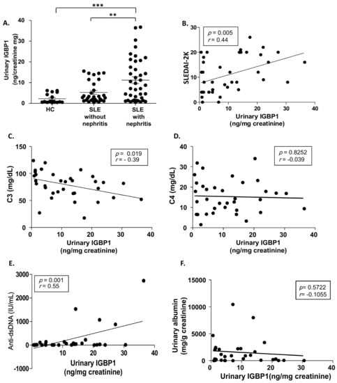 Urinary immunoglobulin binding protein 1 (IGBP1) levels in patients with LN. (A) Urinary IGBP1 levels; Correlation of urinary IGBP1 levels with Systemic Lupus Erythematosus Disease Activity Index 2000 (SLEDAI-2K) (B) complement 3 (C3) levels (C), complement 4 (C4) levels (D) anti-dsDNA levels (E), and albuminuria (F). ** p > 0.01; *** p > 0.001.