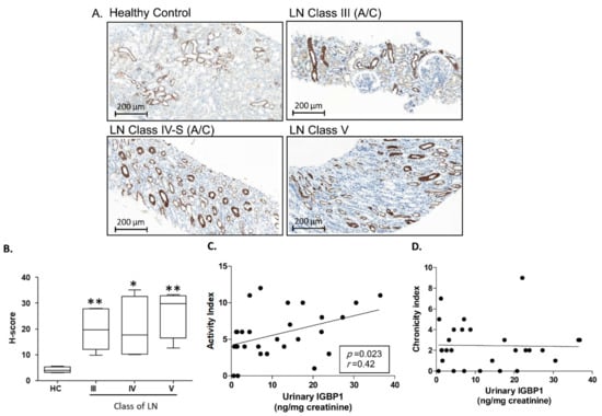 IGBP1 expression in the renal biopsy samples of patients with LN. (A) Immunohistochemical staining of IGBP1; (B) H-score of IGBP1 expression according to the class of LN; Correlation of urinary IGBP1 and histologic activity index (C) or chronicity index (D); * p > 0.05; ** p > 0.01.