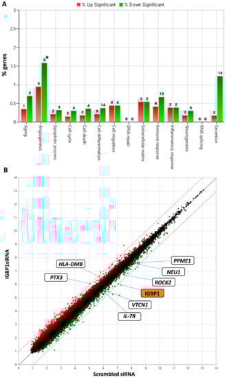 Transcripts regulated by IGBP1 knockdown in HK-2 cells. (A) Regulated biological pathways in IGBP1 siRNA transfected HK-2 cells; (B) Scatter plot of downregulated or upregulated transcripts in IGBP1 siRNA transfected HK-2 cells; *, number of genes.