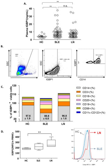 Plasma IGBP1 in SLE patients and distribution of IGBP1 in peripheral blood mononuclear cells (PBMCs). (A) plasma IGBP1 level; (B) IGBP1 expression in CD14+ cells in a patient with nephritis (representative); (C) Distribution of IGBP1 expression according to cell-type; (D) overall IGBP1 intensity in PBMCs; ** p > 0.01.