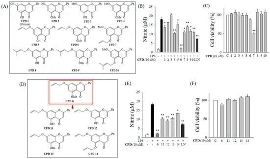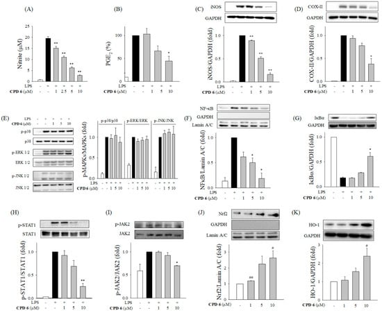 2.2. Inhibitory Effect of CPD 6 on the Release of Inflammatory Mediators from LPS-Stimulated Macrophages