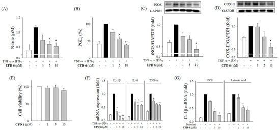 2.3. CPD 6 Downregulates Inflammatory Mediators in Keratinocytes Stimulated by TNF-α/IFN-γ, UV, or Chemical Irritant