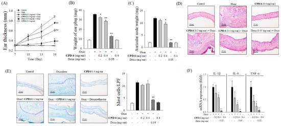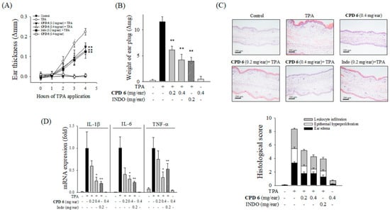 | CPD 6 (0.4 mg/ear) + TPA | 1.77 ± 0.942 ** | 0.67 ± 0.645 ** | 1.83 ± 1.097 ** |