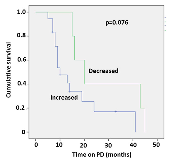 Peripheral venous blood samples were collected and immediately centrifuged, and the serum samples were stored at −80°C until assay. Serum was collected from the patients at baseline, i.e., before the first PD treatment, and at 3 and 6 months of therapy, when available.