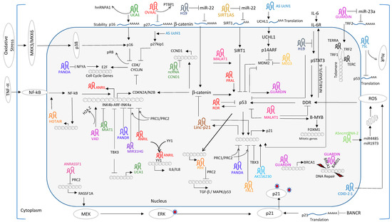 p53 limits the multiplication capacity of cells with DNA damage or deleterious genomic deletions and acts as a guardian of the genome. Activation of p53 is one of the stress responses and is a key initiating event in senescence. Activated p53 initiates pleiotropic events that collaboratively regulate pro-senescence gene expression. Several lncRNAs have been reported as regulators or mediators of the p53 pathway.