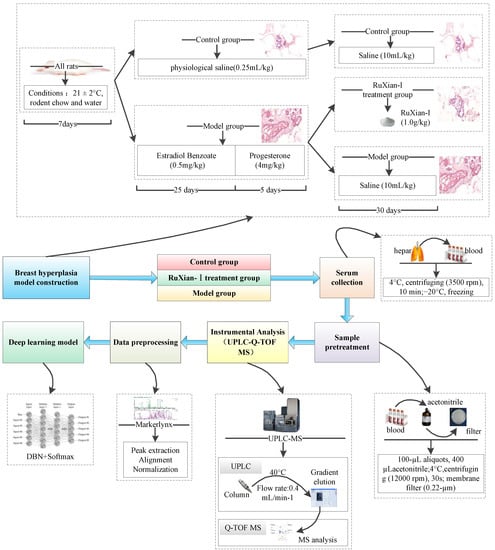 As shown in Figure 1, there were 168 female Wistar rats (bodyweight, 220 ± 10 g) provided by the Affiliated Hospital of Inner Mongolia University for the Nationalities. They were randomly divided into three groups comprising fifty-six rats each: CG, MG, and the RuXian-I treatment group (RG). All the animals were reared under standard conditions (21 ± 2 °C) with free access to rodent chow and water, and they were allowed to acclimatize in metabolism cages for 1 week prior to experimentation. The rats in the CG were injected with normal saline (0.25 mL/kg) for 30 days. The disease model rats were injected with oestradiol benzoate (0.5 mg/kg) for 25 days, followed by progesterone (4 mg/kg) for 5 days. Then, they were randomly divided into two groups (fifty-six rats in each group)—MG and RG. The rats in the RG group were maintained on RuXian-I (1.0 g/kg, oral gavage) for 30 days. The rats in the CG and MG groups were given saline (10 mL/kg, oral gavage) for 30 days. Blood was collected from different groups from the hepatic portal veins and then was centrifuged at 3500 rpm for 10 min at 4 °C. The supernatants were frozen immediately, and then they were stored at −20 °C and thawed before analysis.
