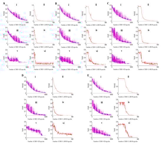 Fine-tuning experimental results on the five-fold data sets. In each subgraph of (A–E), (i) is the fine-tuning error mean square error (FMSE) of DBN+GD+Softmax, (ii) is the fine-tuning misclassification rate (FMR) of DBN+GD+Softmax, (iii) is the test misclassification rate (TMR) of DBN+GD+Softmax, (iv) is the fine-tuning error MSE (FMSE) of DBN+L-BFGS+Softmax, (v) is the fine-tuning misclassification rate (FMR) of DBN+L-BFGS+Softmax, and (vi) is the test misclassification rate (TMR) of DBN+L-BFGS+Softmax.
