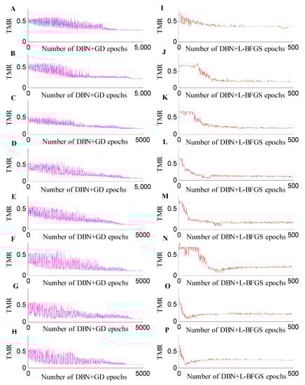 Misclassification rate curve from the 50 to 120 training sets. (A–H) are the training misclassification rate (TMR) curves of DBN+GD+Softmax for the number of training sets from 50 to 120, and (I–P) are the TMR curves of DBN+L-BFGS+Softmax for the number of training sets from 50 to 120.