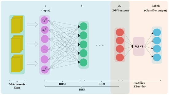 In Figure 4, the unlabelled data are used to pre-train the DBN model, and the labelled data are used to fine-tune the whole coherent system. The metabolomic data are the input layer v, and the output layer hn represents the features of metabolomics generated by DBN. The output layer hn is the input of softmax regression. Therefore, for the MDBN model, we first trained the DBN and then used the labelled data to train the softmax regression. This method can obtain the softmax regression initial weights instead of randomly generated weights, thereby completing the model training more effectively. Finally, after the whole system weights are initialized, fine-tuning optimization can be performed.