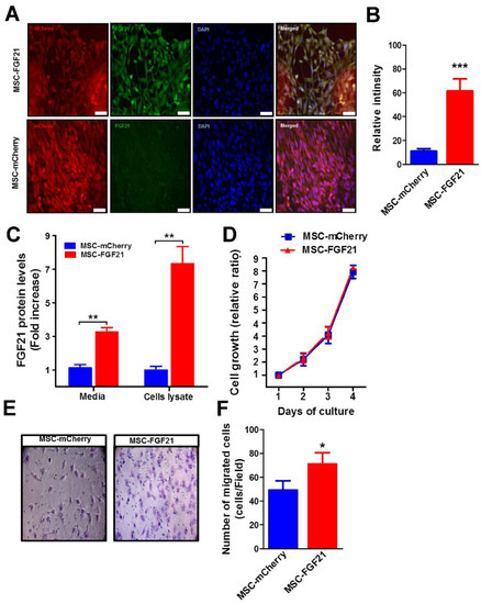 Characterization and in vitro migratory effects of Mesenchymal stem cells (MSCs) that overexpressing Fibroblast Growth Factor 21 (FGF21) and mCherry protein (MSC-FGF21). (A) Representative images from immunofluorescence microscopy was used analyze the expression of FGF21 and transfection efficiency using anti-FGF21 primary and anti-rabbit secondary antibodies conjugates Alexa 488 (green). DNA was counterstained with 4′,6-diamidino-2-phenylindole (DAPI, blue). (B) Quantification of FGF21 expression levels based on Immunofluorescence intensity of FGF21 using ImagJ and ElISA (C). (D) Cell growth was assessed daily for MSCs that overexpress only mCherry protein (MSC-mCherry) and MSC-FGF21 for four days using a trypan blue dye exclusion assay. (E) Representative images (200× magnification) of migrated MSC-mCherry and MSC-FGF21 in transwell assay. (F) The migrated cells are highlighted by crystal violet staining (purple) and were quantified; the MSC-FGF21 showed a significant higher migration ability compared to MSC-mCherry. Data are mean ± S.E.M. of triplicate values from three separate experiments. * p < 0.05, ** p < 0.01, *** p < 0.005. (A,B) Scale bar represents 50 mm.