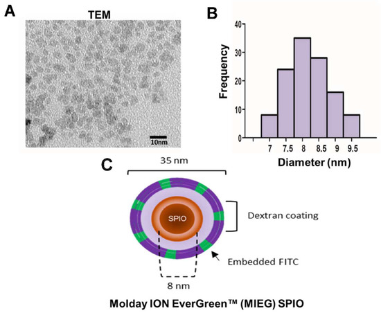 SPIO uptake by cells may depend on the SPION coating, the surrounding medium, and SPION aggregation behavior. The stability of MIEG that would be used for labeling in the environment (DMEM) at a high concentration (200 μg/mL) was investigated by TEM using a Hitachi HT-7700 electron microscope (Hitachi High-Tech, Tokyo, Japan) operating at an 80–200 kV accelerating voltage, which measures variation in core size and was used to evaluate the aggregation behavior. The TEM results show that the morphology of the MIEG is nearly spherical with some agglomerates (Figure 2A). The mean nanoparticles size was approximately 8 nm (Figure 2B), which is smaller than the hydrodynamic diameter (33.6 ± 5.1 nm) suggested by the manufacturer. However, the visual TEM examination revealed the only core, whereas the hydrodynamic diameter is the sum of the core size and the molecules layer.