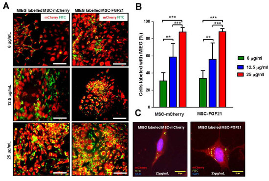 In vitro labeling of MSCs with MIEG. (A) Presence of MIEG in MSCs was detected by fluorescence microscope. Representative images fluorescence microscope of MSC-mCherry and MSC-FGF21 incubated with different concentrations of MIEG for 24 h. (B) Labeling percentage in monolayer cultures of MSC-FGF21 and MSC-mCherry exposed to 6, 12.5, and 25 μg/mL of MIEG for 24 h. (C) Representative fluorescence microscope image demonstrating the characteristic intracellular distribution of MIEG (green) in MSCs after 24 h. Data represent mean ± S.E.M. of triplicate values from three separate experiments. ** p < 0.01, *** p < 0.005. Scale bar 50 μm unless stated otherwise.