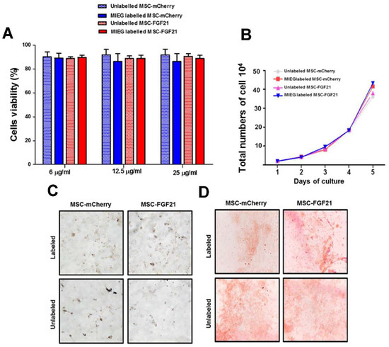 To investigate whether MIEG labeling affected the multipotency of MSC to differentiate into traditional mesenchymal lineages, we evaluated the adipogenic and osteogenic differentiation potency of MIEG labeled MSC-mCherry and MSC-FGF21 in vitro using differentiation media with lineage-specific induction supplement. Both MSC-mCherry and MSC-FGF21 labeled with 25µg/mL of MIEG showed efficient adipogenic differentiation potency as unlabeled cells that revealed from red colored lipid vacuoles following Oil red O staining (Figure 4C). Similarly, MIEG labeling did not affect the osteogenic differentiation potency of MSC-mCherry and MSC-FGF21 (Figure 4D).