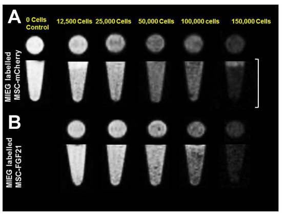 Representative MRI images of a phantom of 100 μL gelatin contain different amounts of MIEG-labeled MSC-mCherry or MIEG-labeled MSC-FGF21 obtained using T2* weighted imaging (T2*WI) based on spin echo are shown in Figure 5. Given the ability SPIO to disturb the magnetic field, resulting in a T2* relaxation time reduction that appears as hypointense microspheres in MRI, MIEG-labeled MSC-mCherry and MSC-FGF21 produce a MRI signal reduction visualized as dark hypointense microspheres. MRI images of MSC-mCherry and MSC-FGF21 MIEG-labeled with 25 μg/mL MIEG revealed that approximately 12,500 cells per 100 mL were still detectable.