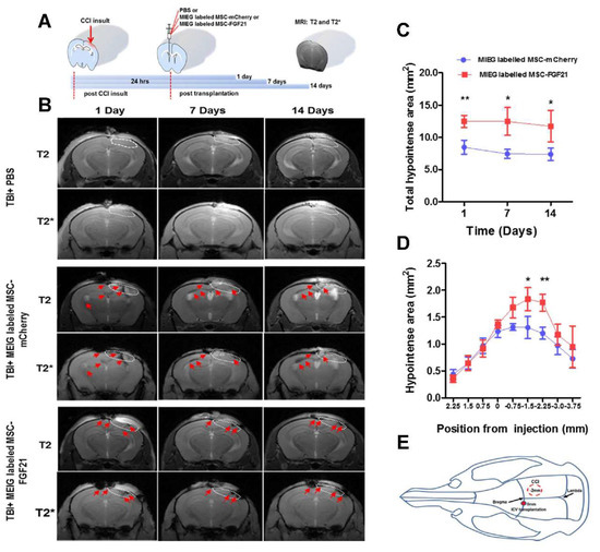 MRI was employed to locate the MIEG labeled-MSC-FGF21 and MSC-mCherry post-transplantation via the effect of the SPIO particles on imaging contrast. We divided 24 mice into 3 equal groups for MRI scanning: (1) TBI-injured animals + PBS, (2) TBI-injured animals + MIEG labeled-MSC-mCherry, and (3) TBI-injured animals + MIEG-labeled-MSC-FGF21.