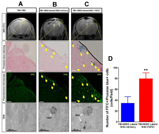 Ex vivo histological analysis. (A–C) Prussian blue staining combined with Fluorescein isothiocyanate (FITC) reactivity 14 days post-transplantation. (C) In MSC-FGF21-treated animals, the iron nanoparticles (blue) in Prussian Blue staining and FITC reactivity that represent MIEG are overlapped and located at the position of MRI hypointensities at the injury site. Similarly, in MSC-mCherry-treated animals, the iron nanoparticles are located to the same areas as FITC and MRI hypointensities and were less pronounced compared to MSC-FGF21 (B). (D) Quantative analysis of the Prussian blue and FITC positive cells numbers at the injury site (A) In PBS-treated animals, iron staining, FITC reactivity, and MRI hypointensities are almost absent at injury site. TEM imaging was used to further investigate the intracellular iron presence at the injury site for all groups (lower panel). The dotted boxed represents the injury site; yellow arrows show Prussian Blue and FITC-positive cells; white arrows show the intracellular MIEG at the injury site. Scale bar is 50 mm unless stated otherwise. Quantified data are mean ± SEM (n = 4 animals per group) of. ** p < 0.01 compared between MIEG labeled MSC-FGF21 and MIEG labeled MSC-mCherry treated TBI animals.