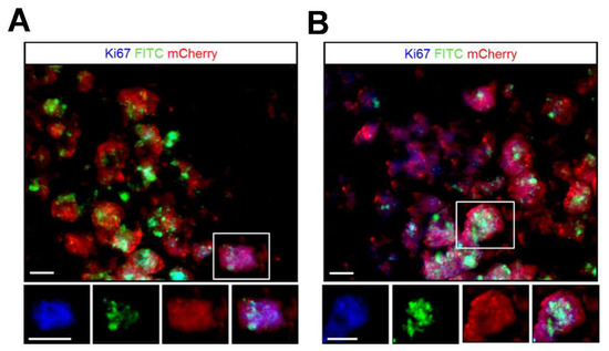 In immunohistochemistry staining, sections were washed with PBS and incubated in 0.2% Triton X-100 in PBS for 15 min. The sections were then blocked with 3% normal goat serum and 3% bovine serum albumin, 0.2% triton X-100 in PBS for one hour and incubated in primary antibody overnight at 4 °C that included anti-mCherry (1:100; GeneTex, Taipei, Taiwan) and Ki67 (1:200; Abcam, Cambridge, UK). Primary antibodies were detected in a 1-h incubation at room temperature with secondary antibodies the appropriate Alexa Fluor 405 or 594, 647 conjugated-secondary antibodies (1:250, Invitrogen) then washed with PBS and coverslipped with mounting medium.