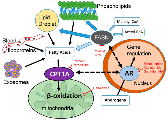 Cross-talk between lipid metabolism and the androgen receptor (AR) in the nucleus. The dotted arrows represent unknown mechanisms connecting fat burning in the mitochondria via CPT1A (carnitine palmitoyltransferase 1A) and fat synthesis in the cytoplasm via the FASN (fatty acid synthase) enzyme. Solid black arrows show direct connections. Red labels and red T-bars represent inhibitory drugs that are used in the clinic. Etomoxir and C75 are not used in humans. This diagram shows some of the sources of fatty acids available to the mitochondria, including the lipids that are newly synthesized via FASN. Light blue arrows show the substrates for FASN and its product, the fatty acid palmitate. This fatty acid of 16 carbons can be elongated and/or desaturated. The proportion of newly synthesized fatty acid that is burned in PCa is unknown, Dark blue arrows show that it can also be used for phospholipid and lipid droplet formation, which contains triglycerides and cholesterol esters. Exosomes delivering lipid droplets and phospholipids also represent another source of fatty acids for beta oxidation. Since androgens are known to regulate CPT1A and FASN enzyme activities, the coordination of fat synthesis and oxidation is likely modulated by the environmental context of the tumor, sometimes tipping the balance more towards synthesis and other times towards oxidation. Elucidating these tumor dependencies will increase the efficacy of lipid metabolic inhibitors and their combination with anti-androgen blockades.
