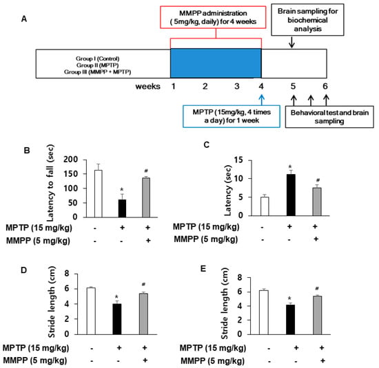 Computer-generated random numbers were used for simple randomization of animals. There were three groups (n = 10 per group): (I) Control group, (II) MPTP group, and (III) MMPP + MPTP group. MMPP was given to group (III) in drinking water daily at a dose of 5 mg/kg for 4 weeks. Mice received an intraperitoneal injection of MPTP (15 mg/kg, TOCRIS) or saline four times a day for 7 days with 2 h intervals. We performed behavioral tests 7 days after the MPTP injections to examine whether there were differences in neurotoxin-induced behavioral deficits between MPTP-treated mice and MMPP-treated mice. Rotarod, pole, and gait tests were conducted as described below. A graphical timeline of the experiment is shown in Figure 1A. MPTP and MMPP were prepared by blinded experimenters.