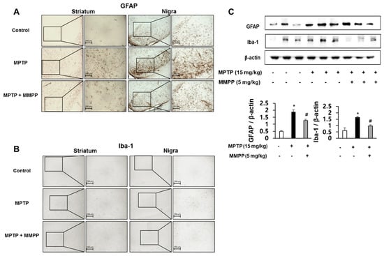 MMPP reduces glial fibrillary acidic protein (GFAP) and Iba-1 expression. The effects of MMPP on reactive astrocytes and reactive microglial cells were measured by immunohistochemical analysis. Immunostaining for GFAP in the striatum and substantia nigra in 20 μm-thick sections of mouse brains with specific primary antibodies and biotinylated secondary antibodies (A). Immunostaining of Iba-1 in the striatum and substantia nigra in 20 μm-thick sections of mouse brains with specific primary antibodies and biotinylated secondary antibodies (B). The representative stained tissues were viewed with a microscope (50× or 200× magnification). (C) Expressions of GFAP and Iba-1 in the substantia nigra were measured by immunoblotting. Values are presented as mean ± SD from 10 mice. *p < 0.05, significant difference from saline-injected mice; #p < 0.05, significant difference between MPTP-injected groups.