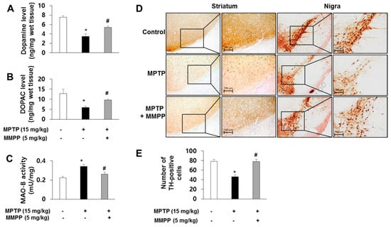 To investigate whether MMPP-induced inactivation of astrocytes could prevent dopamine depletion, we examined the level of DA and its metabolites. To measure the levels of dopamine and DOPAC, quantification was performed with HPLC analysis of striatal tissue. DA and DOPAC levels in the striata of MPTP-injected MMPP-treated mice were significantly increased compared to those in MPTP-treated mice (Figure 3A,B). We also examined MAO-B activity and observed that elevated MAO-B activity by MPTP was reduced by MMPP in the substantia nigra (Figure 3C). We evaluated MPTP neurotoxicity using immunohistochemistry and western blotting for TH. MPTP-induced protein expression of TH in brain tissue was significantly increased in MMPP-treated mice compared to MPTP-injected mice (Figure 4A,B). Decreased numbers of TH-positive cells were recovered from the brains of MMPP-pretreated/MPTP-treated mice compared to MPTP-injected mice (Figure 3D,E).