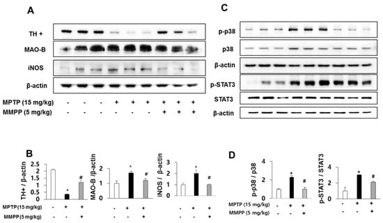 Effect of MMPP on MPTP-induced protein expressions. The effects of MMPP on dopaminergic neuronal cell marker and inflammatory marker proteins were measured by western blotting. Expressions of TH+, MAO-B, and iNOS in the substantia nigra were measured (A and B). Expressions of p-p38 and p-STAT3 in the substantia nigra were measured (C and D). Values are presented as mean ± SD from 10 mice. * p < 0.05, significant difference from saline-injected mice; # p < 0.05, significant difference between MPTP-injected groups.