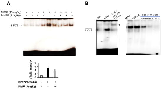 As MAO B-is responsible for the conversion of MPTP to MPP+, we examined MAO-B expression using western blot. MPTP-induced expression of MAO-B was significantly lower in the brains of MMPP-pretreated/MPTP-treated mice than those of MPTP-treated mice (Figure 4A,B). As MAO-B expression in astrocytes is responsible for MPTP metabolism and is induced by MAPK signaling, which is accompanied by reactive astrogliosis, we conjectured that downregulated expression of MAO-B in MMPP-pretreated/MPTP-treated mice may be related to inactivation of the p38 MAPK pathway. Furthermore, MPTP-induced phosphorylation of p38 was significantly reduced in MMPP-treated mouse brains compared to those of MPTP-treated mice (Figure 4C,D). To determine whether MMPP treatment reduced neuroinflammation, we examined iNOS expression using western blotting. MPTP-induced expression of iNOS was significantly lower in the brains of MMPP-pretreated/MPTP-treated mice (Figure 4A,B). To investigate whether MMPP treatment could inhibit the activation of STAT3 after MPTP injection, we measured STAT3 expression by western blotting, and DNA binding activity by EMSA. MPTP-induced expression of p-STAT3 was significantly lower in the brains of MMPP-pretreated/MPTP-treated mice (Figure 4C,D). Translocation of STAT3 was also inhibited in the brains of MMPP-treated mice than in MPTP-treated mice (Figure 5A). STAT3 signaling is triggered by translocation of STAT3 to the nucleus. Upregulated levels of STAT3 in the nucleus fraction were induced by MPTP. However, MMPP reduced STAT3 levels. These results indicate that STAT3 signaling is inhibited by MMPP. The specificity of STAT3 DNA binding activity was confirmed with the super shift assay and competitive and noncompetitive assays (Figure 5B). The STAT3 antibody may create a complex with STAT3 and induce slower migration, which inhibits the DNA binding activity of STAT3. Furthermore, STAT3 translocation was observed in noncompetitive (Poly d-IC) assays, but not in competitive (with dose-dependence of unlabeled oligonucleotide of STAT3) assays. These results showed the specificity of the DNA binding activity of STAT3 in this study.