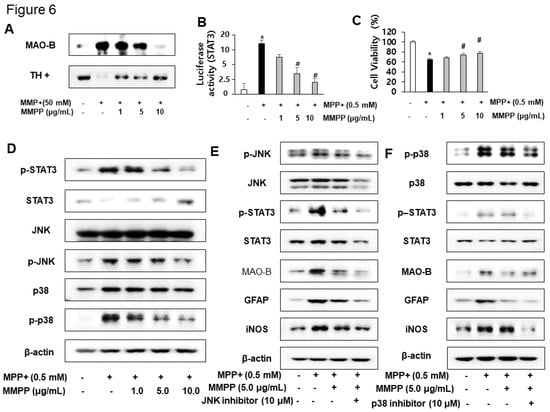Although MMPP increased TH expression, MMPP treatment decreased MPP+-induced MAO-B expression (Figure 6A). To evaluate the effects of MMPP on MPP+-induced inflammation, we first investigated STAT3 luciferase activity. We observed that MMPP attenuated MPP+-induced STAT3 transcriptional activity (Figure 6B). As MPP+ promotes cell apoptosis, we investigated the preventive effect of MMPP. MPP+-induced reduction of cell viability (63 ± 4.3%) was recovered by MMPP treatment in a concentration-dependent manner in primary cultured cells (Figure 6C). Moreover, MPP+-induced expression of p-STAT3, p-JNK, and p-p38 were dose-dependently decreased by MMPP treatment in cultured cells (Figure 6D). To study the involvement of MAPK signaling, we employed specific inhibitors of JNK and p38 in the presence of MMPP (5 μg/mL). MMPP decreased MAO-B and pro-inflammatory protein (iNOS and GFAP) expression following MPP+ treatment in cultured cells. The MMPP-induced inhibitory effect was amplified by co-treatment with p38 and JNK inhibitors in cultured cells (Figure 6E,F).
