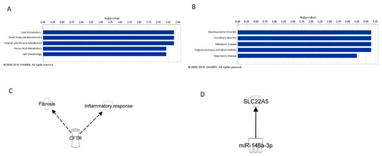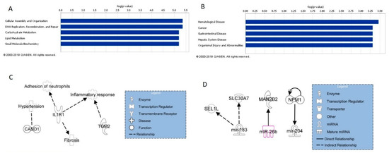 All mRNAs and miRNAs concordant between mouse lung tissue and SAEC or HMVEC at any time point were input into Ingenuity Pathway Analysis® (IPA; QIAGEN Inc., https://www.qiagenbioinformatics.com/products/ingenuitypathway-analysis) for analysis of potential cell signaling involvement. The top five molecular and cellular functions associated with the concordant mRNAs are summarized in Figure 1A, while the top five associated diseases and disorders are summarized in Figure 1B. Additionally, these mRNAs were also analyzed for their involvement in diseases and functions previously reported to be related to MWNCT exposure [19]. Several mRNAs listed in Table 1 and Table 2 were found to be associated with fibrosis, inflammatory response, adhesion of neutrophils, and hypertension (Figure 1C); mRNAs that were not currently found to be involved in these processes were removed. To determine potential signaling regulation between tissue and cell concordant mRNAs and miRNAs, all mRNAs and miRNAs concordant between mouse lung tissue and SAEC or HMVEC at any time point were input into IPA and analyzed for potential connections, which are shown in Figure 1D.