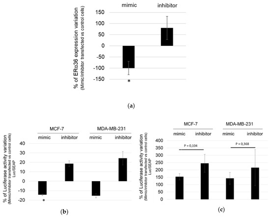 hsa-miR-136-5p mimic/inhibitor directly modulates ERα36 expression. (a) MCF-7 cells were transfected with either hsa-miR-136-5p mimic or inhibitor. ERa36 expression was measured by RT-qPCR analysis 24 h after transfection, and the percentage of ERα36 expression variation in hsa-miR-136-5p mimic or inhibitor transfected cells versus control ones was calculated. MCF-7 or MDA-MB-231 cells were co-transfected with hsa-miR-136-5p mimic or inhibitor and (b) the pMIR-Report-Luc-ERα36wt plasmid or (c) the pMIR-Report-Luc-ERα36mut one. Luciferase activity was measured 24 h after transfection using the Bright-Glo™ luciferase assay system. To evaluate the transfection efficacy and normalize the results, cells were also transfected at the same time with the pEZX-PG04-Secreted alkaline phosphatase plasmid. The alkaline phosphatase activity was measured 24 h after transfection in the culture medium with the Secrete-Pair™ Gaussia luciferase dual and single luminescence assay Kit. Each bar represents mean ± S.E.M. (a) N = 5 (b) N = 3 and (c) N = 5. * P < 0.05.