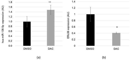 Many microRNAs are epigenetically regulated trough the methylation status of their promoter [30]. hsa-miR-136-5p is located in the DLK1-DIO3 imprinted locus of chromosome 14q32, which contains a cluster of noncoding RNAs and the antisense gene RTL1, all differentially regulated by the methylation status of the IG-DMR. Methylation changes in this locus, which may affect gene or microRNA expression associated with Temple or Kagami–Ogata syndrome and oligometastastic phenotype [31,32]. Therefore, we hypothesized that expression of hsa-miR-136-5p could be upregulated after cell exposure to the demethylating agent DAC and thus downregulate ERα36. The MCF-7 cells were treated for 48 h with DAC or DMSO as control. DAC exposure did not alter cell viability (data not shown). MicroRNAs and long mRNAs were harvested from the same cells. hsa-miR-136-5p expression level (Figure 3A) and ERα36 expression (Figure 3B) were measured using RT-qPCR. DAC treatment induced a significant 48% increase of hsa-miR-136-5p expression as well as a 59% decrease of ERα36 expression. The upregulation was independent of the hsa-miR-136-5p sponge CRNDE (colorectal neoplasia differentially expressed gene) (Figure S2).