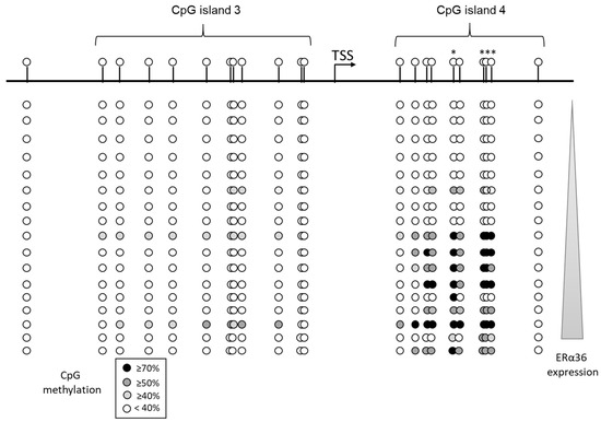 ERα36 expression is related to the methylation status of its promoter in breast tumor samples. Seventeen breast tumor samples were collected from the tumor biobank of the Cancerology Institute of Lorraine. ERα36 promoter genomic DNA was submitted to bisulfite sequencing and ERα36 expression level was performed by real-time PCR analyses in triplicates for each tumor sample. The correlation between each CpG methylation and ERα36 expression was established by a MATLAB program (Pearson rank correlation test). * CpG which methylation level is significantly (P < 0.05) correlated to ERα36 expression level.