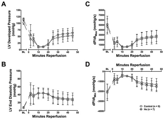 Langendorff perfused hearts. Helium did not result in increased recovery after global ischemia in the Langendorff perfused isolated heart 24 h after exposure. Cardiac function was measured as (A) left ventricular developed pressure (LVDP), (B) left ventricular end diastolic pressure (LVEDP), (C) contractility (dP/dtmax) and (D) lusitropy (dP/dtmin). Data are presented as mean ± standard deviation (SD) (n = 7 for helium, n = 9 for control) and results were considered significant when p < 0.05.