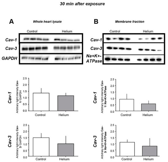 Cav-1 and Cav-3 levels in cardiac tissue 30 min post helium exposure. (A) Cav-1 and Cav-3 levels measured by western blot analysis in whole-heart tissue of mice as was the internal standard GAPDH, n = 8. (B) Cav-1 and Cav-3 levels measured by western blot analysis in membrane fractions of mice, as was the internal standard Na+K+-ATPase, n = 4. Data are shown as mean ± SD. No significant differences were observed in the different tissues 30 min post He exposure, suggesting that He does not have an effect on Cav-1 and Cav-3 levels in heart tissue 30 min post exposure.