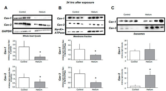Given the unexpected loss of He-induced protection in the isolated perfused heart, we hypothesized that He might induce protection through release of various circulating factors related to caveolin that have been shown to be protective in anaesthetic-induced cardiac protection [,,]. We initially performed western blot analysis of the whole-heart tissue and membrane and cytosolic fractions of heart tissue, as well as exosome isolation from platelet free plasma (PFP). We observed no changes in Cav-1 or -3 in whole-heart lysates and membrane tissue fractions at 30 min post He exposure (Figure 2). However, when we assessed Cav-1 and Cav-3 protein levels in these compartments at 24 h post He inhalation, we observed a loss of Cav-1 and -3 in whole-heart lysates and membrane fractions in the He-exposed mice (Figure 3A,B, units are average light intensity), whole heart (Cav-1: 0.4 ± 0.3; Cav-3: 0.7 ± 0.3) compared with the time-matched control (Cav-1: 1.7 ± 0.7; Cav-3: 1.3 ± 0.4) (both p < 0.05), and membrane fraction (Cav-1: 1.0 ± 0.2; Cav-3: 0.5 ± 0.2) versus control (Cav-1: 2.2 ± 1.1; Cav-3: 1.4 ± 0.4) (both p < 0.05); no changes in cytosolic fraction were observed. Accordingly, exosomes isolated from PFP showed significantly increased Cav-3 expression and a tendency of increased Cav-1 in the He-treated mice (Figure 3C) (Cav-1: 13.5 ± 7.6; Cav-3: 12.7 ± 4.1, Cav-3 p<0.05) versus the time-matched control (Cav-1: 11.6 ± 2.1; Cav-3: 1.6 ± 1.4). These data suggest that He exposure produces caveolar-membrane-specific modifications leading to the release of circulating Cav-3-enriched factors that may potentiate the protective effects of He.