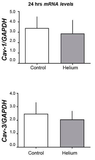 Given the loss of caveolins from heart tissue and the increase in serum, we determined if the loss of caveolin in the heart was related to changes in mRNA. Cav-1 and -3 qRT-PCR was performed 24 h after He inhalation. Neither Cav-1 nor Cav-3 mRNA levels changed at this time point (Figure 4). These data suggest that the decreased levels of Cav-1 and -3 at the 24-h time point are caused rather by altered protein translocation/secretion than by transcriptional regulation.