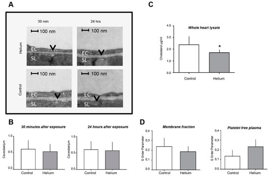 To further determine the impact of He exposure on cardiac ultrastructure, we performed transmission electron microscopy analysis of heart tissue and characterization of membrane fluidity and PFP. The analysis of images with 11,000× magnification on the left ventricle showed no differences in the number of caveolae/µm in sarcolemma (Figure 5A,B) at either 30 min or 24 h post He exposure. Further ultrastructural analysis focusing on the size, shape and organization of subsarcolemmal and intermyofibrillar mitochondria of cardiomyocytes showed no obvious changes. However, when the whole-heart lysate was assessed for cholesterol (a major structural component of membrane and caveolae), a significant decrease was observed 24 h after He inhalation (1.63 ± 0.05 vs. 2.39 ± 0.70 in controls; p < 0.05; Figure 5C) suggesting subtle changes to ultrastructure may be induced by He in the heart.