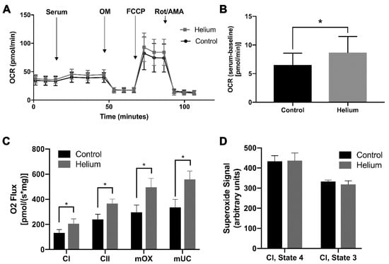 Biological effects of helium-conditioned serum on mitochondrial function. All assays utilized serum collected 24 h post exposure. (A) L6 muscle cells were treated with serum (5%) from control or helium-exposed mice. Seahorse Bioscience mitochondrial stress was assessed. Oxygen consumption rate (OCR) was measured before and after the addition of inhibitors (oligomycin, a complex V inhibitor; FCCP, a protonophore; and antimycin A and rotenone, complex III and I inhibitors, respectively) to derive parameters of mitochondrial respiration. (B) After addition of serum mean OCR was calculated after normalizing for baseline OCR of the L6 cells. (C) High-resolution respirometry analysis was performed using the Oroboros O2k-Respirometer. Serum from control and helium-exposed animals was incubated with naïve mouse heart ventricular tissue. Respiratory function of complex I and II activity (CI, CII), maximum oxidative phosphorylation capacity (mOX) and maximum uncoupled capacity (mUC) are shown after addition of complex I substrates glutamate and malate. (D) Electron paramagnetic resonance (EPR) with a DEPMPO spin probe was used to assess superoxide formation in isolated mouse heart mitochondria exposed to serum from control and helium-exposed animals under state 3 and 4 conditions with complex I substrates. All assays utilized n = 4–6 samples/group.