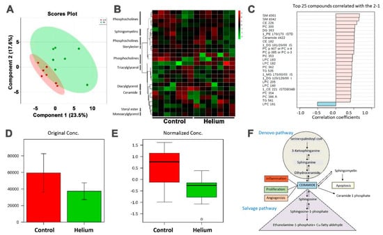 No differences were observed in primary metabolites after correcting for false discovery rates early and late after He exposure (see supplementary metabolomics analysis report, Tables S2–S5, Figures S1 and S2). Next, we specifically assessed circulating lipid metabolites in He-treated versus the control group using liquid and gas chromatography. Evaluation of untargeted metabolomic profiling of He versus control group serum identified 174 known lipid metabolites (Table S2). The metabolites failed the FDR analysis with a lowest FDR value of 0.8, indicating no significant differences between the lipid metabolites of the control group and the helium group. There were principal component analysis similarities between the He and control groups. The partial least squares discriminant analysis (PLS-DA), which is a multivariate overfit model, also showed overlap between the He and control groups (Figure 7A). A heat map based on the normalized data and p values showed more green compared to red in the control group, indicating a lower abundance of some metabolites in the helium group compared with the control group (Figure 7B). Similarly, a list of metabolites positively and negatively correlated with the He and control groups is listed in Figure 7C. Removing the outliers as determined by the Metaboanalyst (Quebec, QC, Canada) outlier algorithm showed the ceramide group to be differentially regulated in He versus the control group (Figure 7D,E). The sphingolipid metabolic pathway is associated with ceramide, and may be important to lipid raft/caveolae regulation. This is represented by pathway annotation (Figure 7F).
