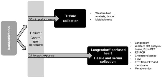 Animals were exposed in a standard cage plexiglass chamber (#7060R, Columbus Instruments, OH, USA) for 30 min at a flow of 5 L/min to either a treatment of 70% He/30% oxygen mix, or a concentration of 30% oxygen in air as a control group. After 30 min or 24 h, blood was collected through cardiac puncture and hearts were excised under deep pentobarbital (50 mg/kg i.p.) anaesthesia, flash frozen in liquid nitrogen and stored at –80 °C until further processing (Figure 8).