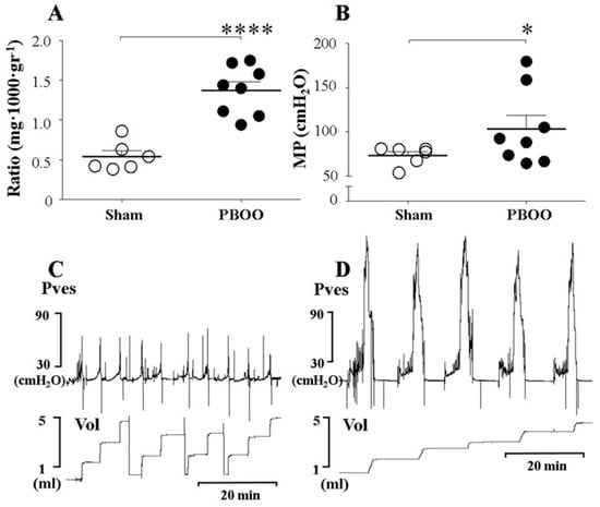 - Choi, B.H.; Jin, L.H.; Kim, K.H.; Kang, S.A.; Kang, J.H.; Yoon, S.M.; Park, C.S.; Lee, T. Cystometric parameters and the activity of signaling proteins in association with the compensation or decompensation of bladder function in an animal experimental model of partial bladder outlet obstruction. Int. J. Mol. Med. 2013, 32, 1435–1441. [Google Scholar] [CrossRef]